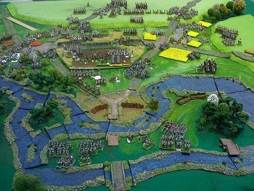 The first photo shows the opening moves. The village of Aspern is on the left with Marshal Massena taking personal command of the infantry assigned to defend it. On the right is the village of Essling with its massive stone Granary. In the center is the raised road defended with cavalry because no other troops were available. At the bottom is the bridgehead where it can be seen that a single division had managed to arrive before the forward pontoon bridge was destroyed. Engineers were sent into the swift flowing river to conduct repairs. At the top of the map, there are dust clouds marking where Austrian reinforcements are approaching.