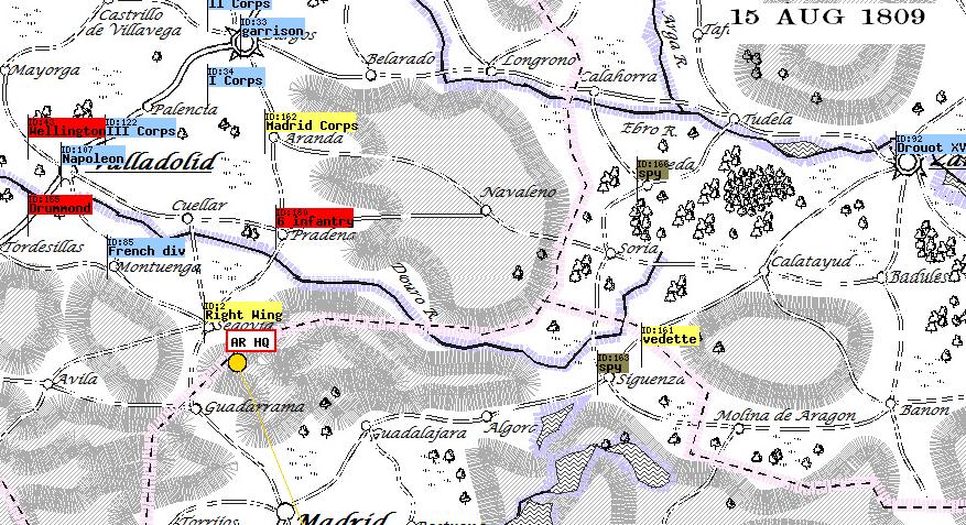 15th The newspapers report that Wellington was badly defeated at Cuellar on Aug 12th. A message from Drummond arrives to tell me that he is still only at Salamanca and that he is not getting any word from Wellington. The British seem to have gotten themselves roughly handled due to a breakdown in communications. My Madrid Corps Headquarters was overrun and destroyed. That tells me that at least some French units are on the road between Burgos and Valladolid where the HQ had retreated to. What was called Madrid Corps should be south of Burgos and I expect them to be attacking it on the morrow. My right wing, meanwhile, is assembled at Guadarrama and I order it to move on Segovia. I will accompany it. |