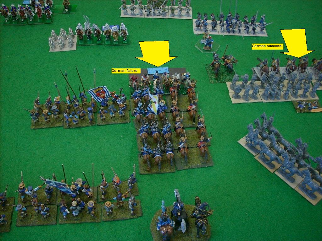 The German cuirassiers are broken and the French horse pour through the gap in pursuit of what remains. They cannot avoid the protestant infantry to their front but perhaps they are inspired by the success of the enemy protestant cavalry against the English pike blocks.